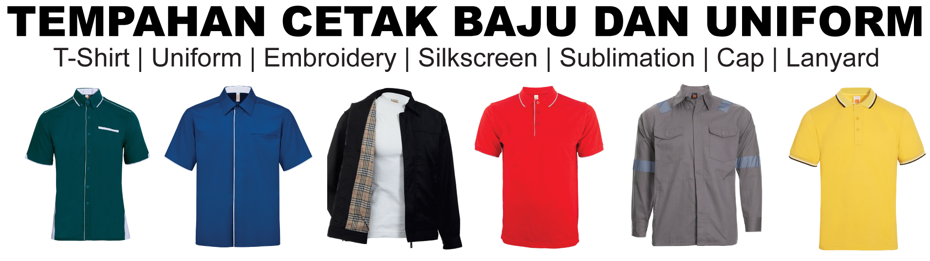 Kami ada pelbagai pilihan untuk baju dan uniform anda. Cetakan silkscreen, heatpress, sublimation jersi, korporat uniform dan sulaman logo berkomputer.